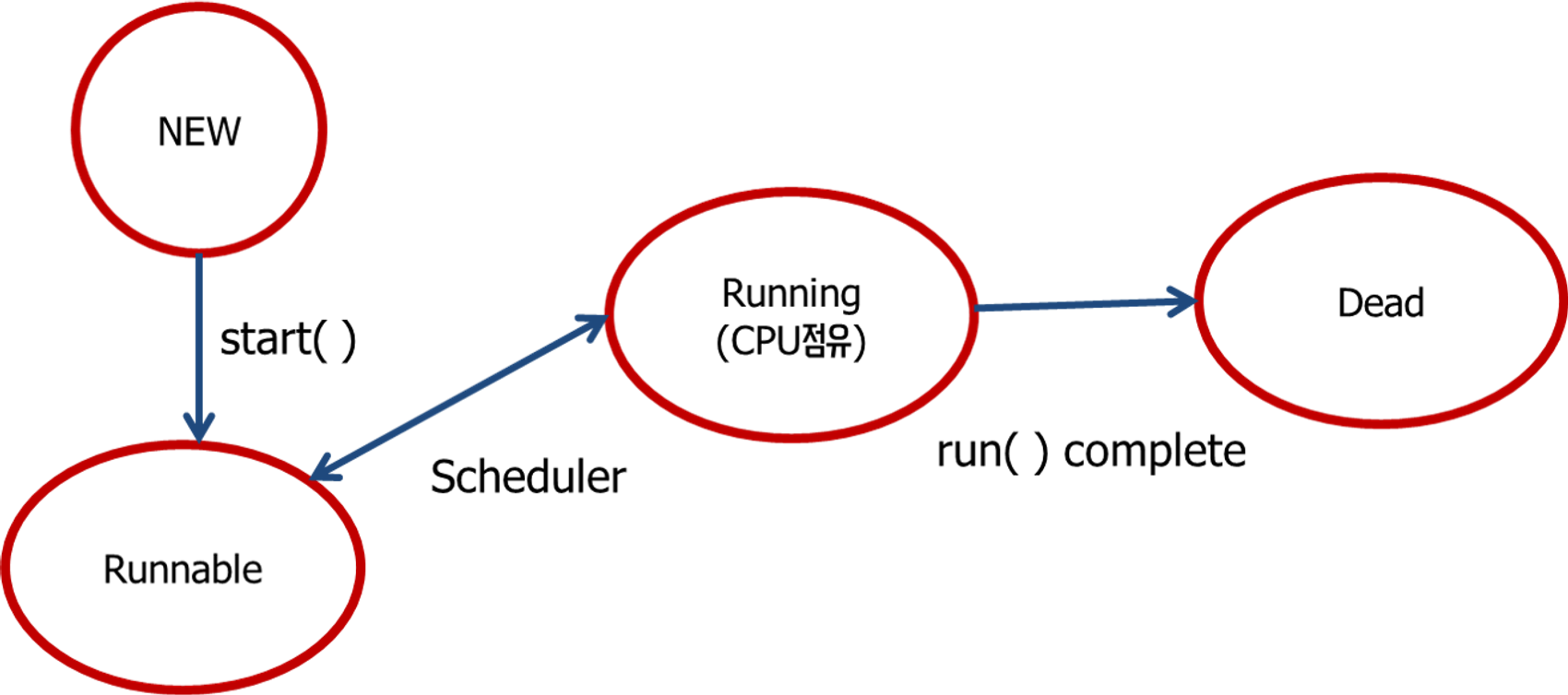 - thread객체를 만들면 new 로 객체들이 만들어짐. start() 하면 runnable 형태로 Thread queue에 들어감.